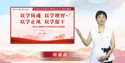 何淑贞教授通过微视频向当地群众带来了题为《以学铸魂 以学增智 以学正风 以学促干--努力在主题教育学习中取得实实在在的成效》的思政微课。何教授从总体上阐述了主题教育的意义和重要性,并结合自身学习体会,对深入推进主题教育的关键问题进行了深入剖析。她指出,这次主题教育是一件事关全局的大事,广大党员、干部要将焕发出来的学习工作热情转化为攻坚克难、干事创业的强大动力。何教授详细解读了主题教育的四个方面,即以学铸魂、以学增智、以学正风、以学促干。她强调,要紧扣“学思想、强党性、重实践、建新功”的总要求,立足浙江特色和义乌特色,学做结合,扎实推进主题教育走深走实见行见效。