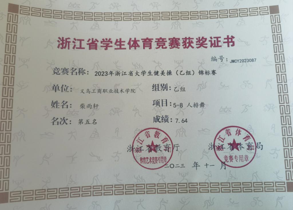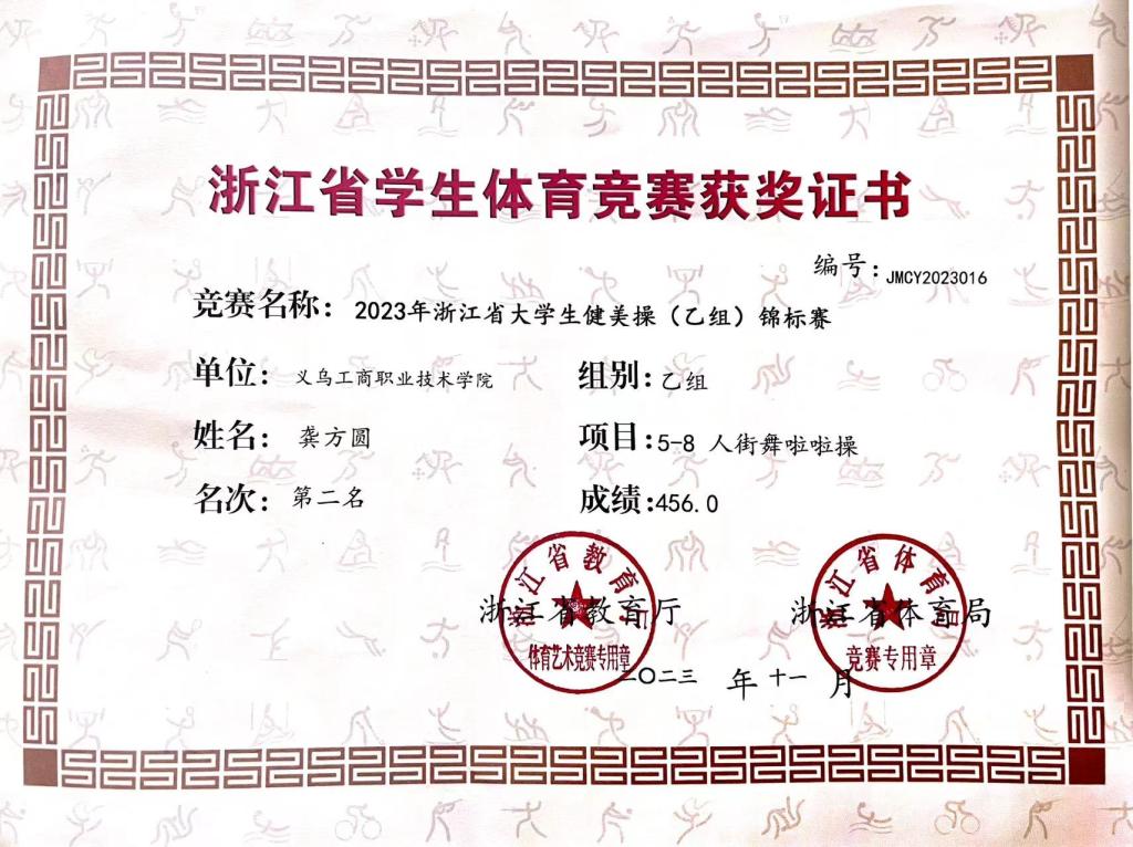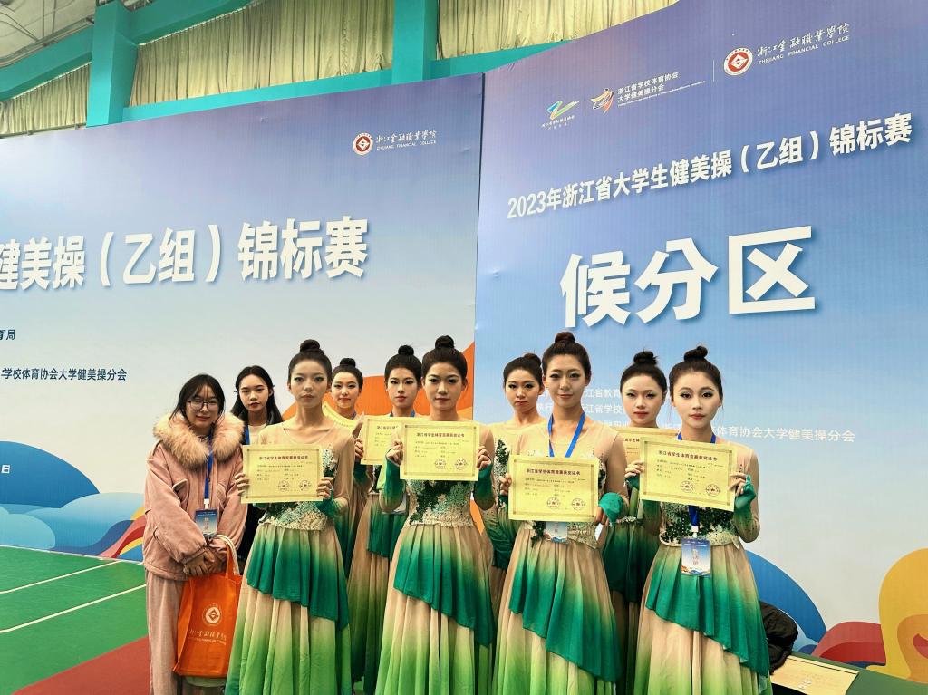 11月24日-26日,由浙江省体育局、浙江省教育厅主办的2023年浙江省大学生健美操锦标赛在浙江金融职业技术学院拉开帷幕。来自全省28所大专院校,共计400余名运动员参加。我校健美操队获得乙组街舞啦啦操亚军,排舞第五名的好成绩。
