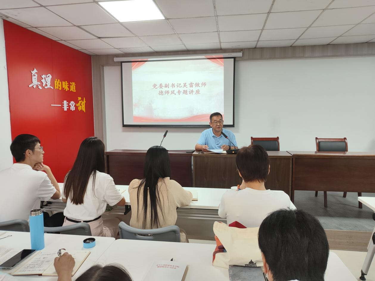 为进一步加强师德师风建设,贯彻落实《义乌工商职业技术学院师德师风问题专项整治工作实施方案》相关要求,马克思主义学院于2023年9月11日开展师德师风专题讲座,学院党委负责人吴雷作师德师风专题报告,马院全体教职工参加讲座。