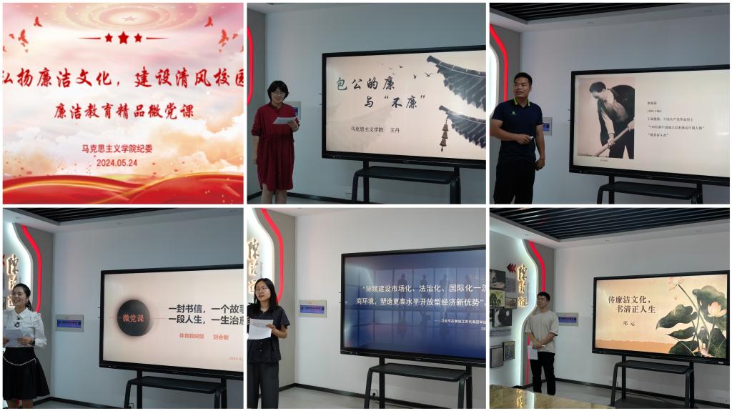 为高质量开展党纪学习教育,深入贯彻省委关于勤廉浙江建设部署要求和学校纪委“清风五月”党风廉政教育系列活动安排,进一步弘扬校园廉洁文化,推动清廉校园建设走深走实,马克思主义学院(公共基础学院)于5月24日中午在学院望道行实践教学中心开展“弘扬廉洁文化,建设清风校园”廉洁教育精品微党课大赛。马克思主义学院负责人等出席本次活动,5位党员教师参赛,部分党员教师列席观摩。