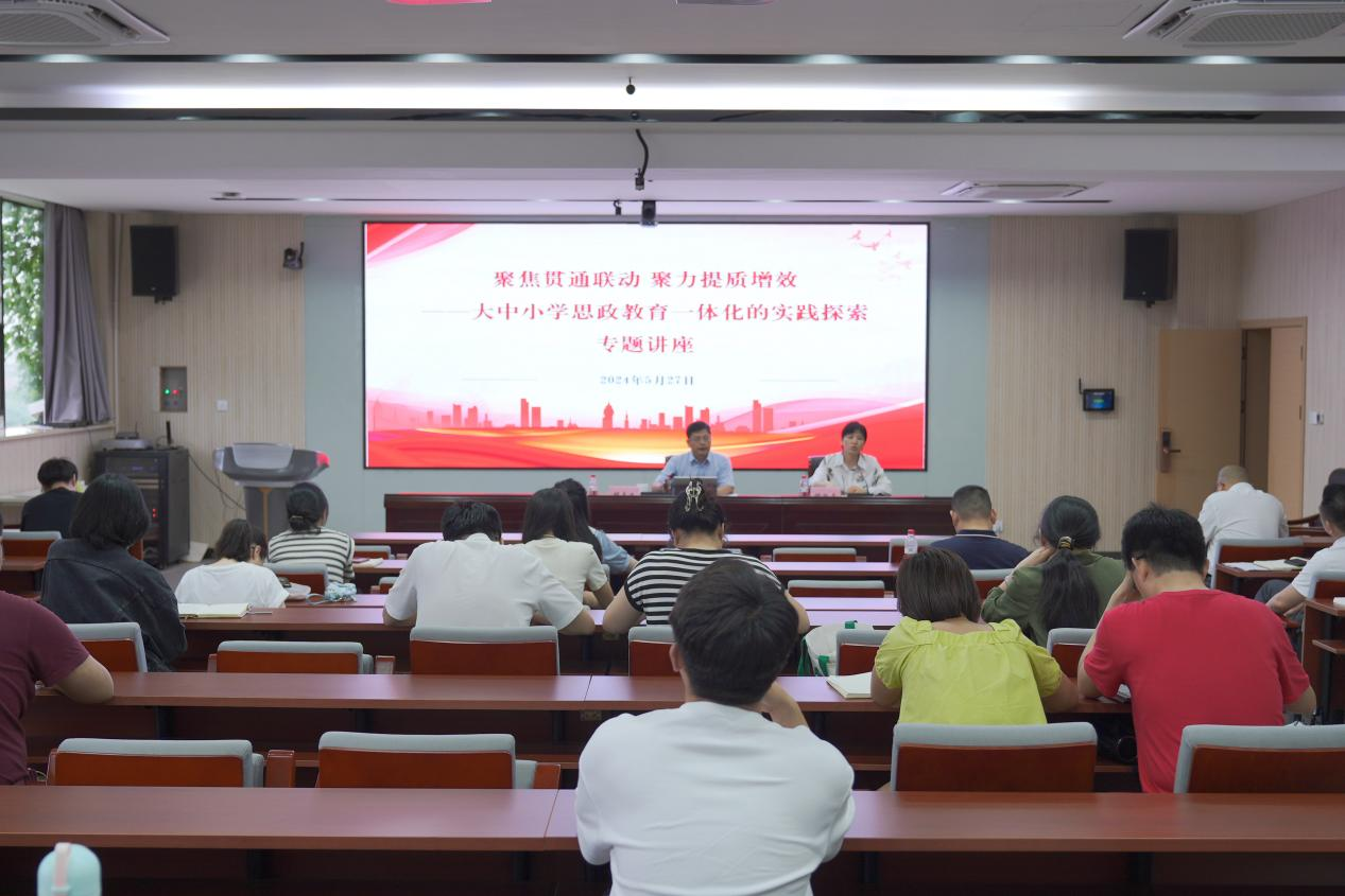 为进一步推进思政教育改革,提高思政教育质量,推动我校大中小学思政教育一体化工作内涵式发展,5月27日下午,我校在望道楼419举办了以“聚焦贯通联动 聚力提质增效”为主题、以“大中小学思政教育一体化的实践探索”为内容的讲座。各二级学院党委负责人、学工办主任、辅导员、马院全体思政教师、“义乌市大中小学思政教育一体化建设联盟”成员单位思政教师共100余人参加,共同研究学习思政教育一体化的新理念和新实践。讲座由马克思主义学院负责人主持。