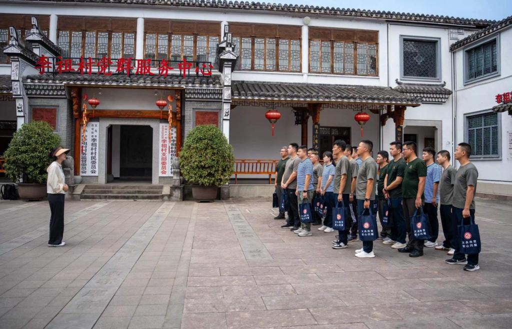 退役士兵们在党群服务中心门前认真聆听李祖村蝶变的故事