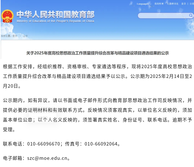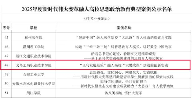 近日,教育部思想政治工作司公示了2025年度高校思想政治工作质量提升综合改革与精品建设项目遴选结果。经组织推荐、资格审核、专家遴选等程序,马克思主义学院牵头申报的新时代伟大变革融入高校思想政治教育典型案例《“义乌发展经验”融入高校“大思政课”建设的创新实践》成功入选。