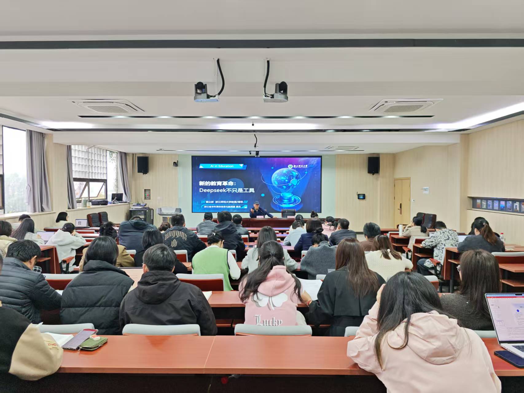 为积极响应国家教育数字化战略,深入贯彻《教育强国建设规划纲要(2024—2035年)》精神,推动智能技术与教育教学的深度融合,11月17日下午,马克思主义学院在望道楼419教师发展中心报告厅举办了“教育革命——DeepSeek不只是工具”专题培训。浙江师范大学智慧教育研究院副院长、博士生导师黄立新教授受邀担任主讲,学院全体教师参加学习。