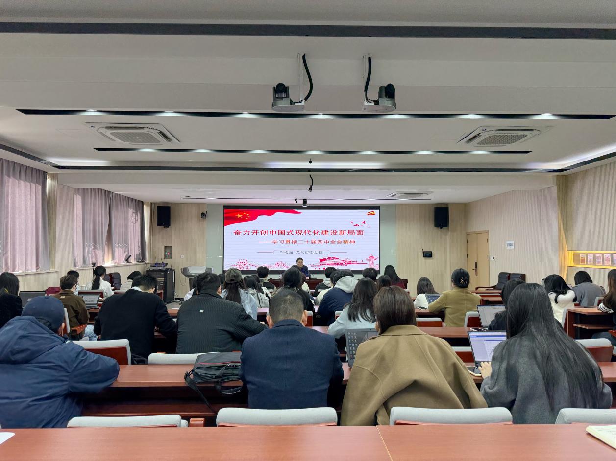 11月26日下午,马克思主义学院与义乌市委党校在望道楼419举行了党的二十届四中全会精神联学活动。活动特邀义乌市委党校周松强副校长作专题辅导报告。马克思主义学院教师代表、学校新入职教师和学生代表等五十余人参加活动。