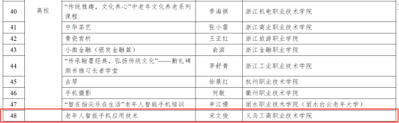 近日,中共浙江省委老干部局、浙江省教育厅、浙江省卫生健康委员会发布了《关于公布2023年浙江省老有所学相关项目名单的通知》和《关于公布2023年浙江省老年教育优质师资库名单的通知》,我校马克思主义学院宋文俊老师负责的《老年人智能手机应用技术》成功入选省级老年教育特色课程,宋文俊、张瑞芳两位老师同时入选全省老年教育优质师资库名单、全省老年教育“领雁”教师培养对象。这是我校老年教育特色项目推介和师资培养的重大突破。