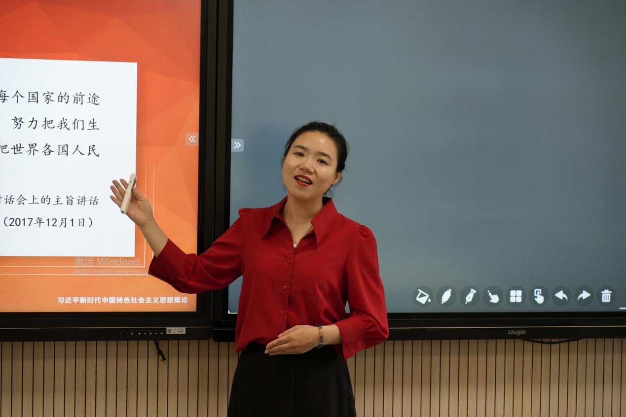 方瑾老师选取了《推动构建人类命运共同体》向与会老师展示了《习近平新时代中国特色社会主义思想概论》课程的章节教学。授课过程中,她综合利用情景教学法、案例分析法、分组讨论法等教学方法,让学生们结合“中国——中亚峰会成果清单”,以小组形式从政治、安全、经济、文化、生态五个方面探讨人类命运共同体的内涵,遵循“一案到底并横向延伸”的原则,结合全球安全倡议、全球发展倡议、全球文明倡议详细分析了中国为推动人类社会发展进步贡献的中国方案和中国智慧,在提高了学生们的参与度和积极性的同时,也引发了同学们如何立足专业、投身实践,为推动构建人类命运共同体贡献青春力量的思考。