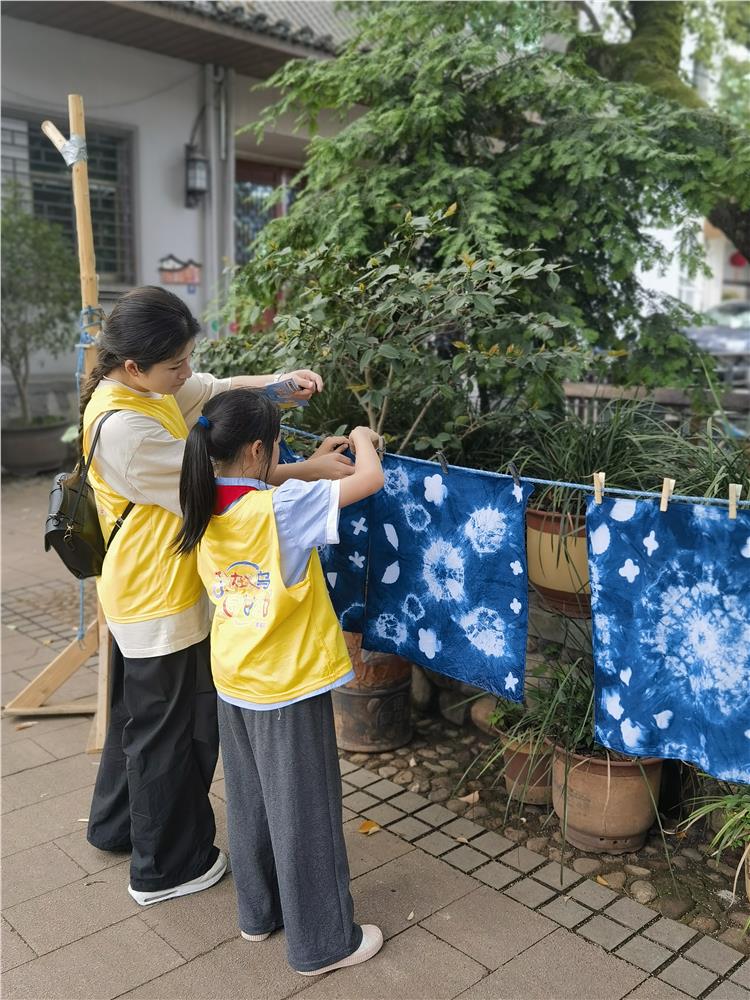 在李祖村的非遗扎染工坊,蓝白交织的布料成为连通古今的媒介。大学生化身“小老师”,引导小学生们亲手体验捆扎、浸染、氧化等传统工序。当孩子们看到自己设计的现代图案在古老技法中绽放,兴奋不已。“原来老手艺也能这么酷!”塘李小学学生兴奋地展示作品。这不仅是工艺的传承,更是文化如何在创新土壤中焕发新生的直观课堂,为“文化振兴”写下生动注脚。