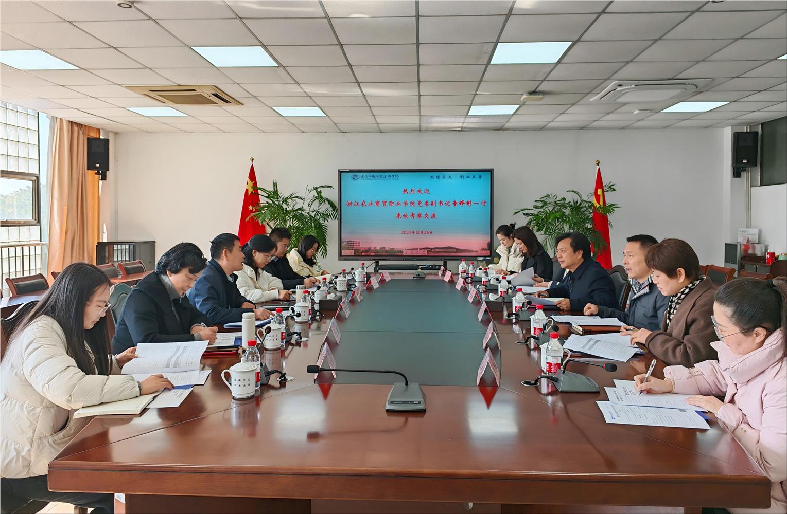 12月26日上午,浙江农业商贸职业学院党委副书记童铧彬一行来访我校,围绕“大思政课”特色品牌建设及两校联合承办2026年全省思政课协作组“大思政课”品牌建设专题研讨会等事宜展开深入交流。义乌工商职业技术学院党委副书记叶斯源出席交流活动并致辞,学校相关职能部门负责人、马克思主义学院领导班子及骨干教师参加座谈。