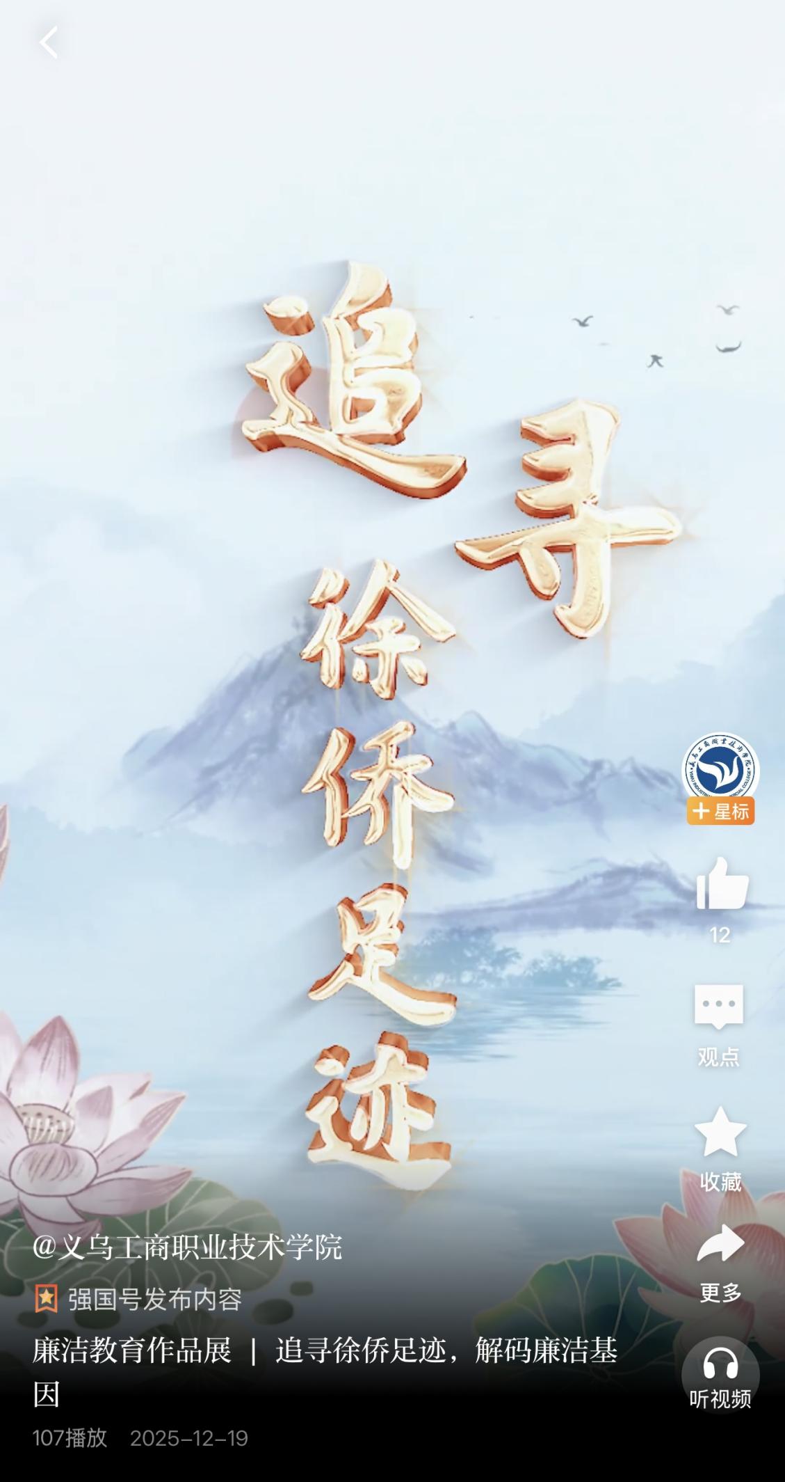 我院高度重视此次廉洁教育系列活动,紧扣活动主题,深度挖掘地方廉洁文化资源,精心组织师生团队筹备创作。作品以义乌一代廉吏徐侨为核心,立足本土特色廉洁文化,追寻其廉洁足迹、解读其廉洁理念,将徐侨的廉洁事迹与学校廉洁教育、青年成长实际深度融合,以生动鲜活的视听语言、贴近学子的表达形式,生动诠释廉洁内涵、传递廉洁力量,充分展现了我校学子敬廉崇洁、笃行致远的青春风貌。